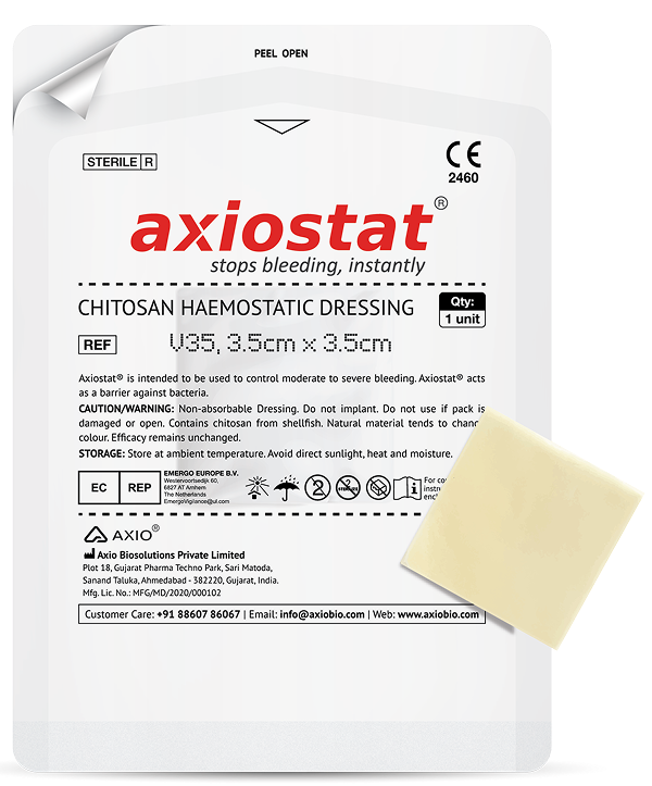 Once applied, do not lift/remove Axiostat, not even to check haemostasis. Apply secondary dressing to keep Axiostat in position